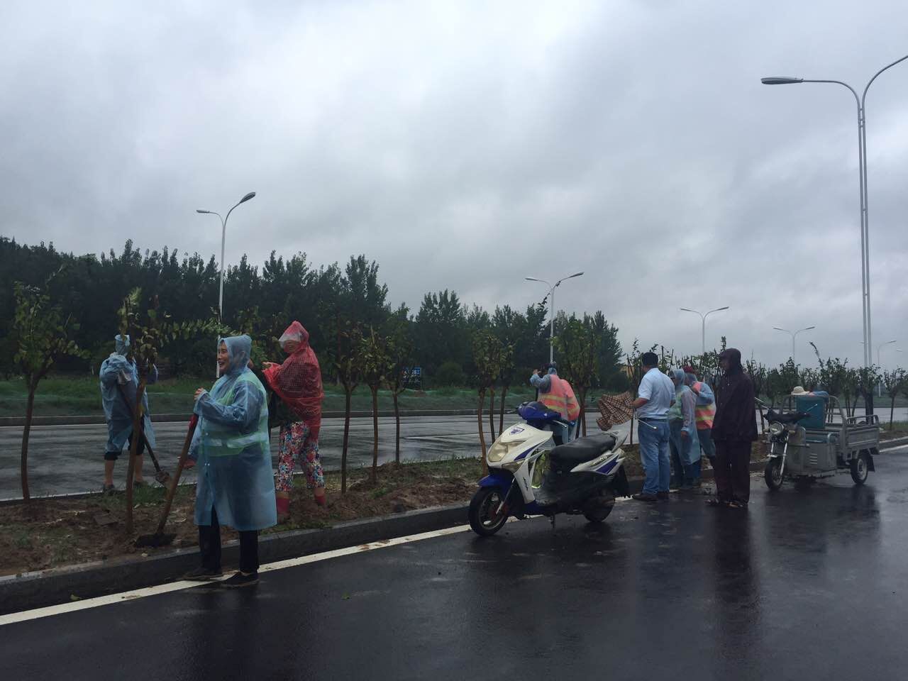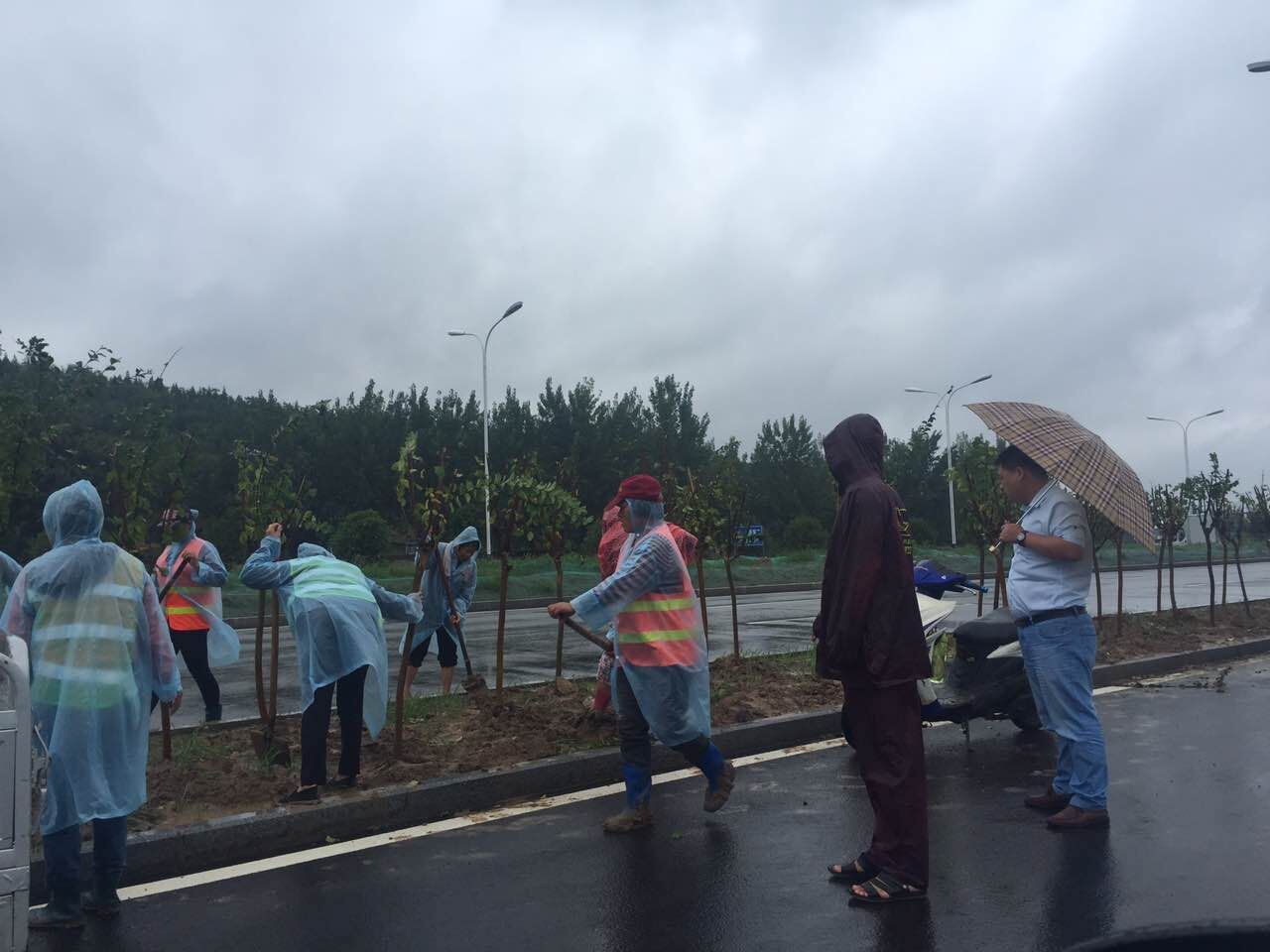 生態(tài)景觀公司為確保樹(shù)木成活率,雨中搶種綠化樹(shù)木