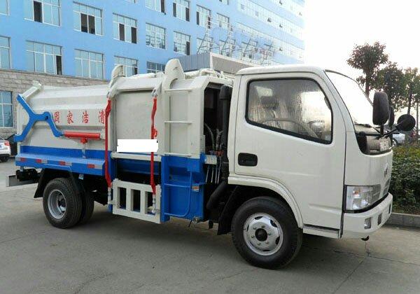 b.車上配置:有效裝載容積5立方,箱體采用邊三底四碳鋼板制作,箱體前部側面帶有掛桶提升機構,可自動舉升垃圾桶倒入垃圾,帶自卸功能,尾部裝有橡膠密封條,防污水滴漏。
